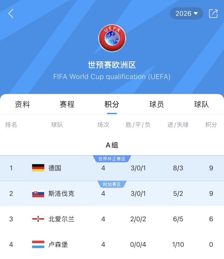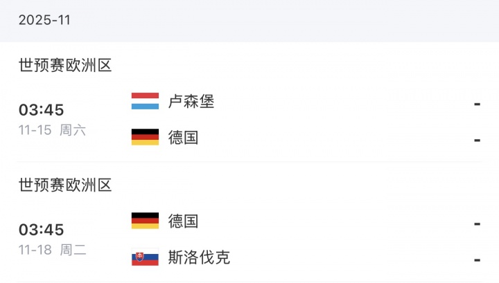 德国队现在辞世初赛欧洲区4战3胜1负排行A组榜首,球队本次外洋比赛日将对阵卢森堡和斯洛伐克。