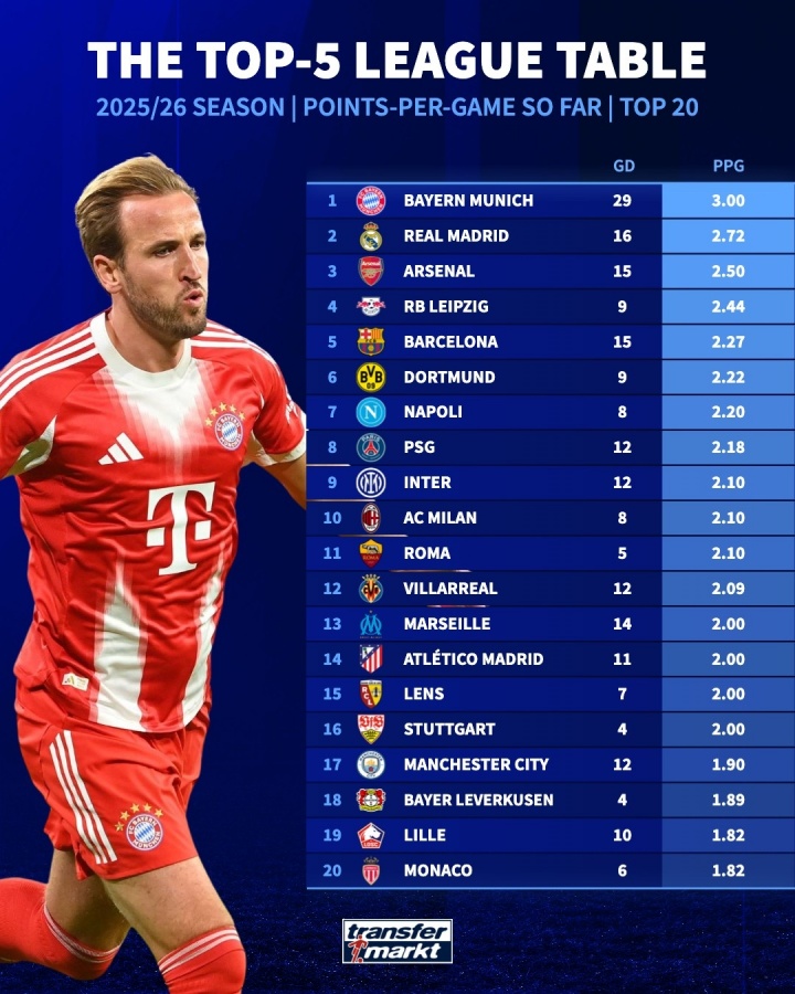 全胜+净胜29球!5大联赛场均积分榜:拜仁3分居首,皇马枪手列2-3