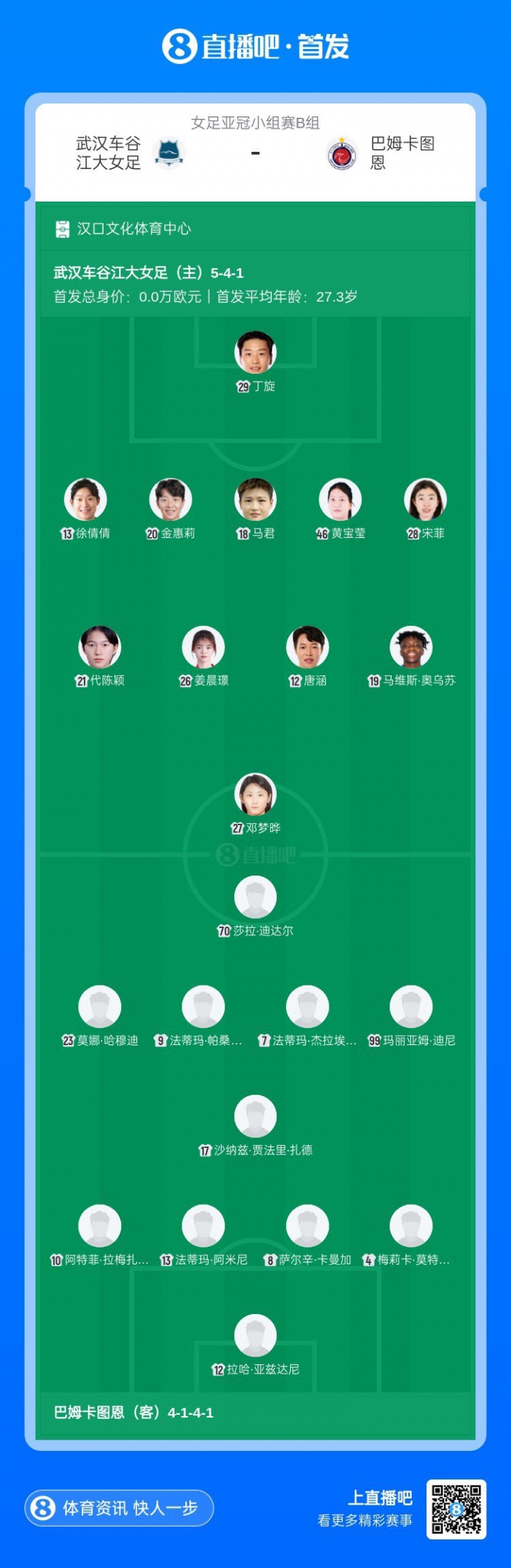11月23日讯 女足亚冠小组赛B组,武汉车谷江大女足将在主场迎战巴姆卡图恩。赛前,两边公布了首发。