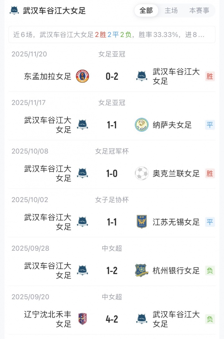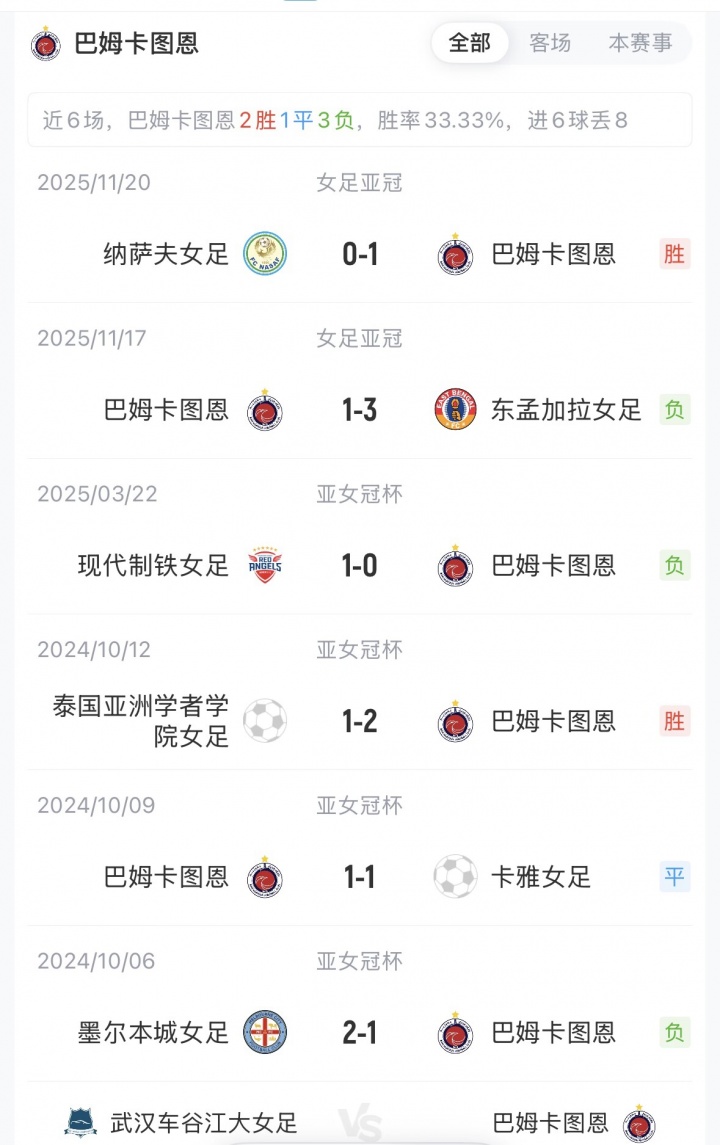 当今,武汉车谷江大女足1胜1平积4分名次B组第1,巴姆卡图恩1胜1负名次B组第3,两边暂无交锋历史。