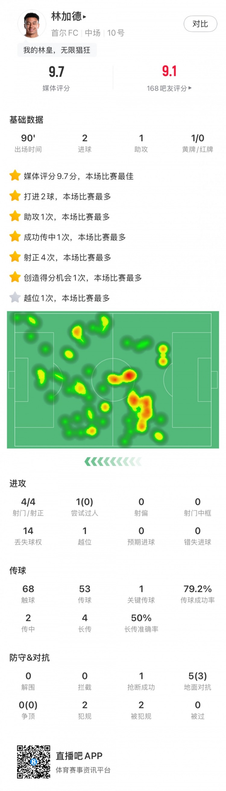本场比赛“林皇”林加德凯旋参与首尔FC沿途进球,孝顺2射1传,赛后踢满全场的他得回了全场最高的9.7分。