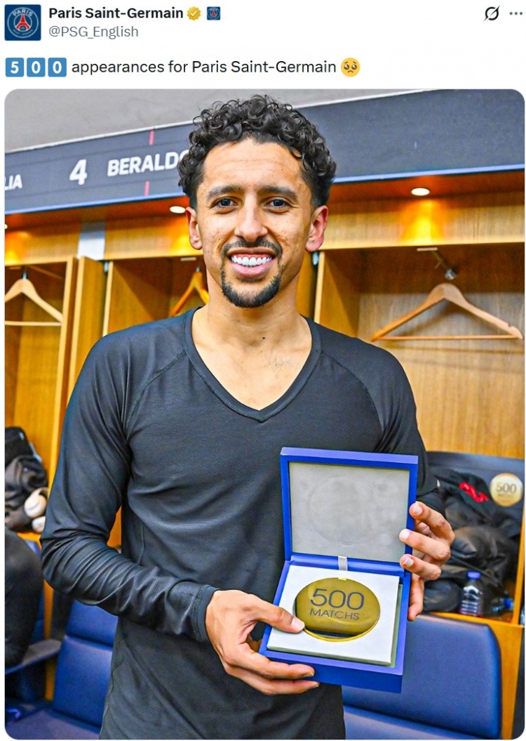 马尔基尼奥斯实现巴黎500次出场里程碑,赛后获颁球队操心奖章