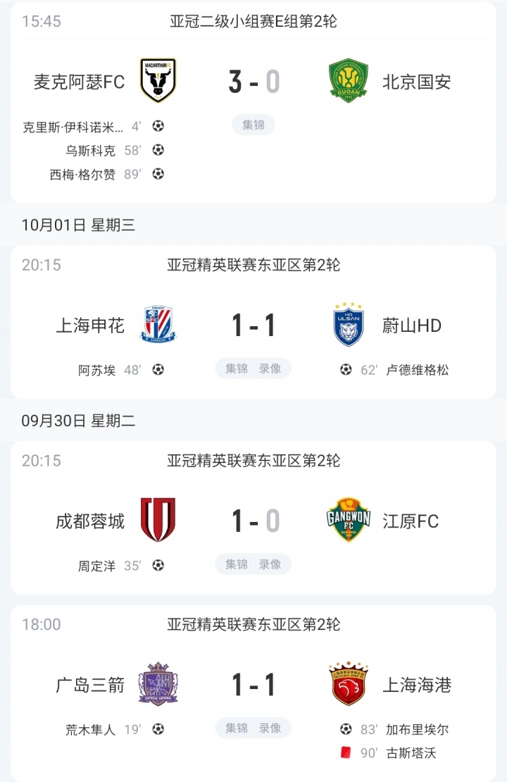 10月02日讯 亚冠二级联赛第二轮,北京国安客场0-3不敌麦克阿瑟FC。亚冠精英联赛/二级联赛第2轮,中超球队得到1胜2平1负的战绩,4支球队总战绩来到1胜3平4负。