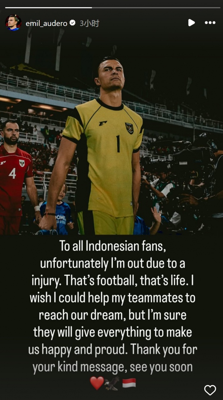 印尼门将奥代罗社媒:我因伤退出本期国度队,感谢全球的祝愿信息