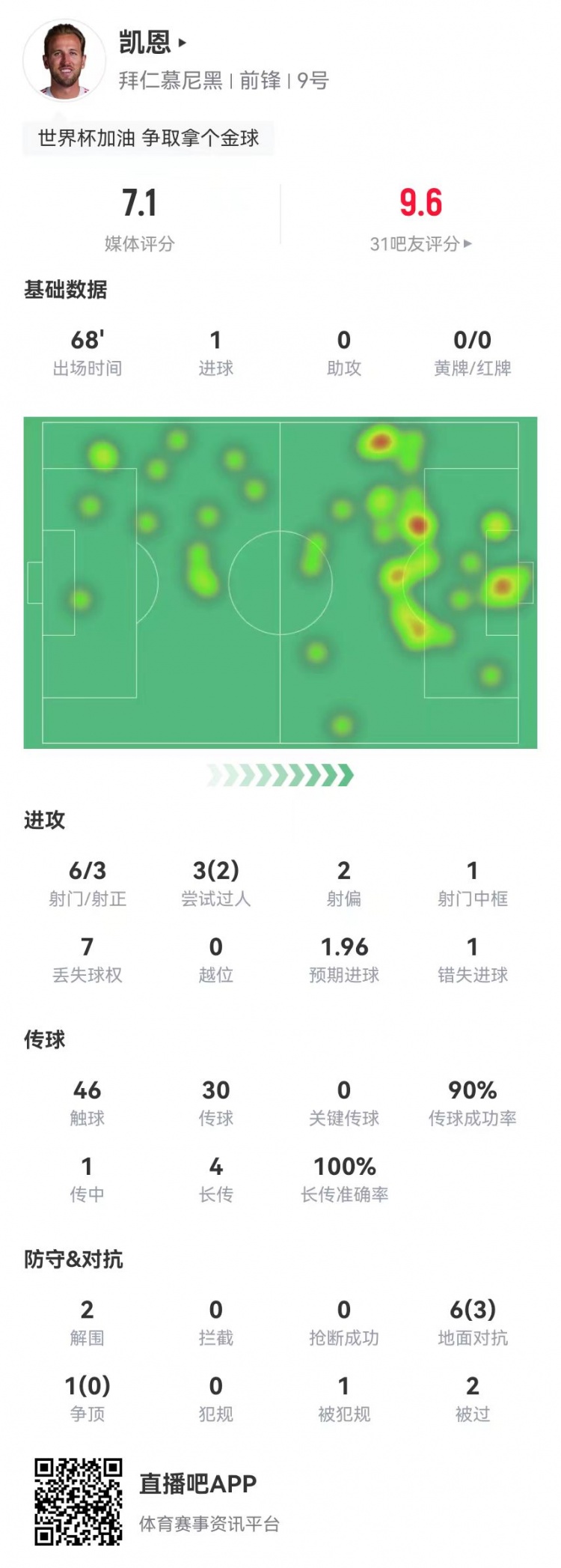 凯恩本场6射3正进1球+1中框+1失良机 4长传一王人奏效 获评7.1分