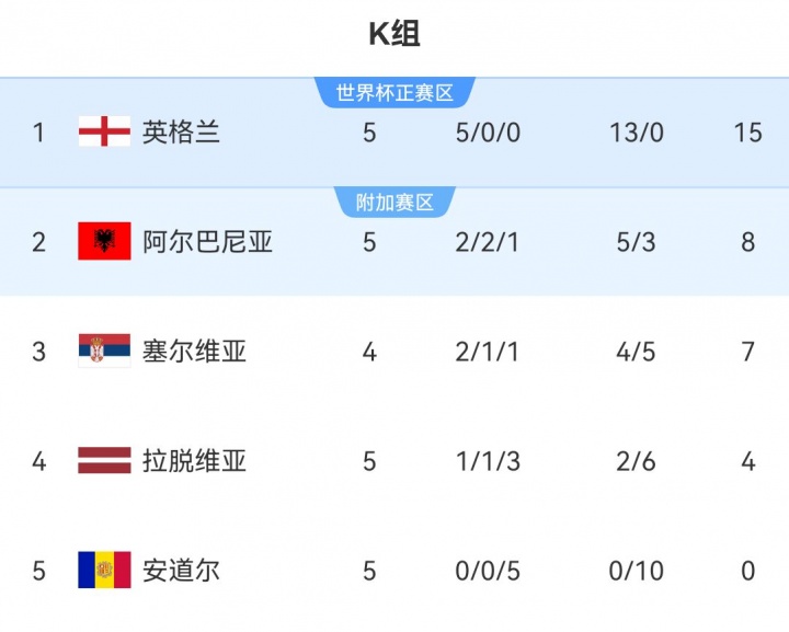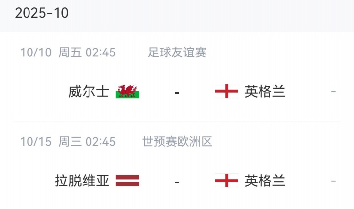 英格兰将于10月10日在友谊赛中对阵威尔士,10月15日世初赛客场挑战拉脱维亚。当今,英格兰活着初赛欧洲区K组5战全胜排行小组第1。
