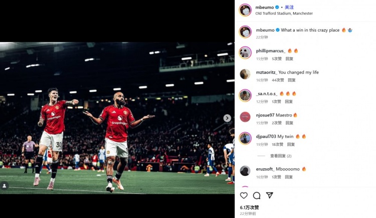 10月26日讯 曼联在本轮英超焦点战4-2力克布莱顿,姆伯莫梅开二度。