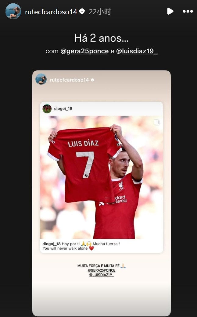亲戚或余悲!遗孀社媒牵挂“若塔举球衣声援迪亚斯”:2年前…
