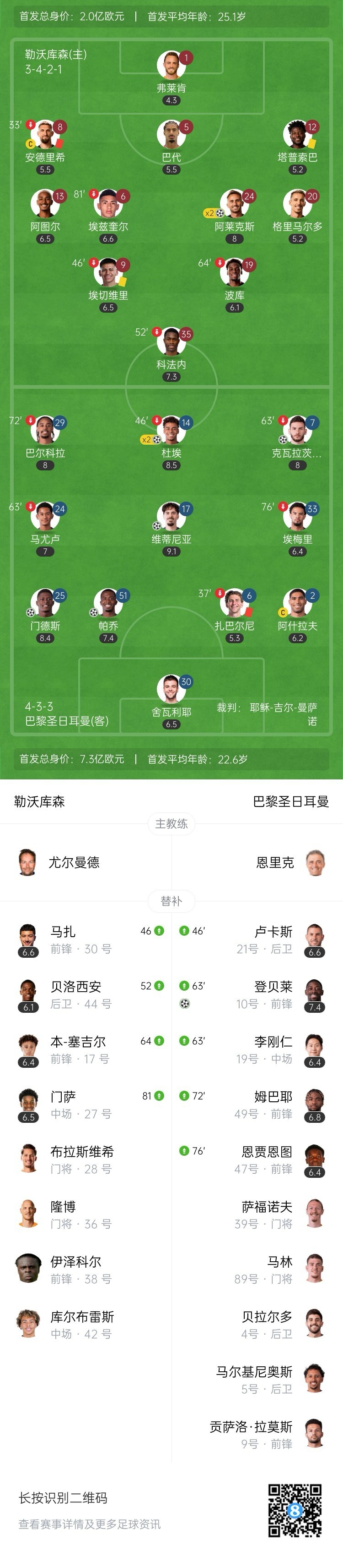 本场比赛上半场比分已是巴黎4-1勒沃库森,两边此时齐是十东说念主作战。下半场跳跃的巴黎却统共充公手,除了换上卢卡斯(因扎巴尔尼红牌)补充后防外,其余上阵的替补全是时尚:登贝莱、李刚仁、姆巴耶、恩贾恩图。最终巴黎下半场又轰3球,全场比分7-2。