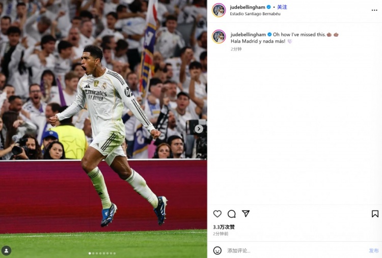 贝林厄姆社媒晒庆祝照挂念打进制胜球:哦我是何等念念念这种嗅觉!