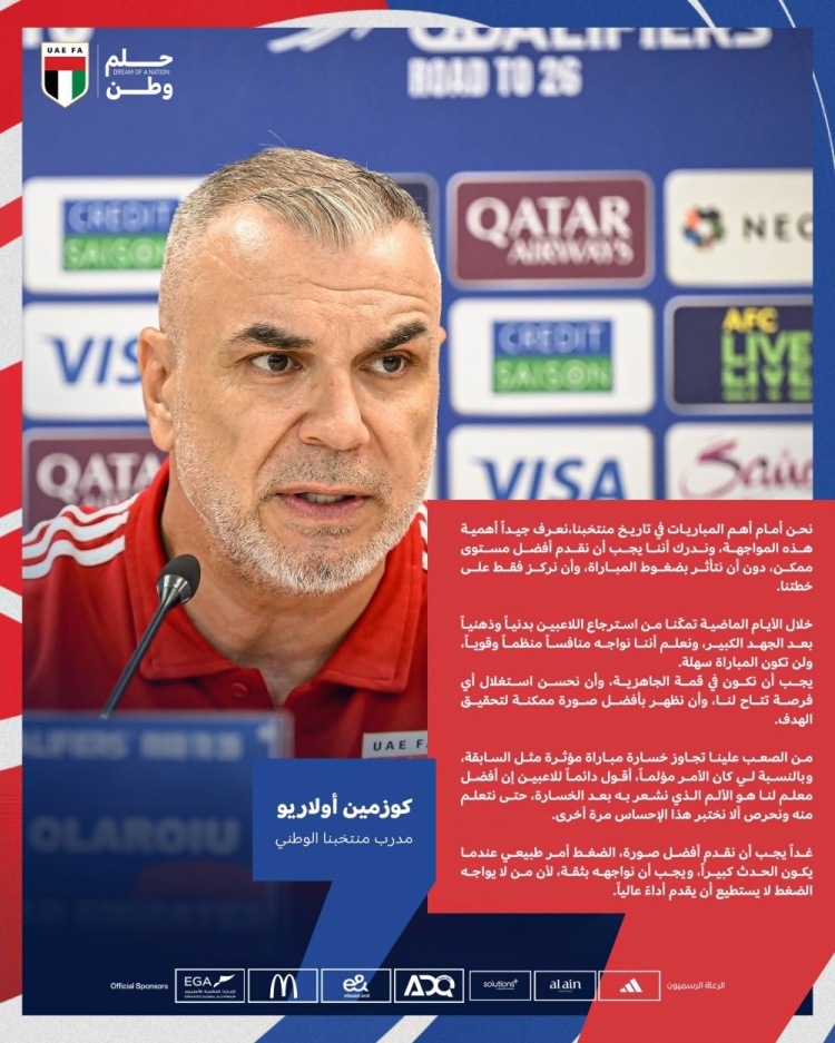 奥拉罗尤说谈:“咱们正濒临着作事生活中最伏击的一个篇章,亦然阿联酋国度队历史上一个要道时刻,咱们知谈必须要任重道远,理财挑战。