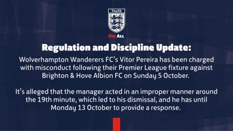 日前,英足总官方发布公告:“狼队主帅佩雷拉在10月5日周日对阵布莱顿的英超联赛后被指控行径失当。据称,佩雷拉在第19分钟傍边行径失当,这导致他被罚下场,他需在10月13日周一前对此作出复兴。”