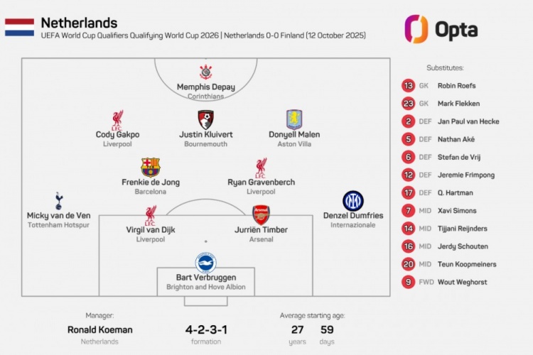 10月13日讯 世初赛欧洲区小组赛,荷兰在主场迎战芬兰。本场比赛,荷兰再次排出了莫得任何别称荷甲球员的首发声势,这是橙衣军团本年第5次作念出如斯安排。此前,荷兰国度队所有年份莫得排出荷甲球员的首发声势也仅有5次资料。