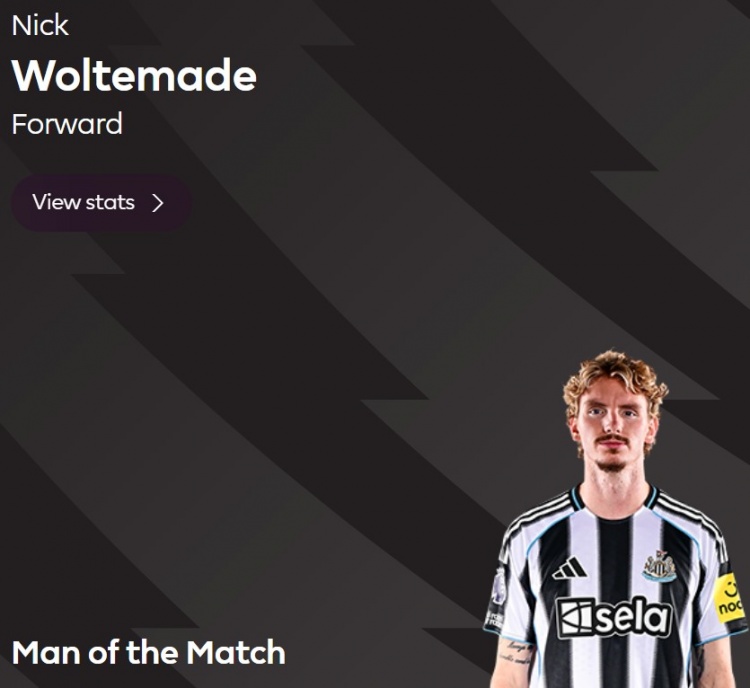持续4场破门,英超官方:沃尔特马德当选纽卡1-2布莱顿全场最好