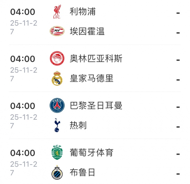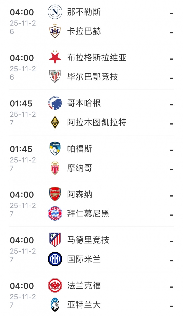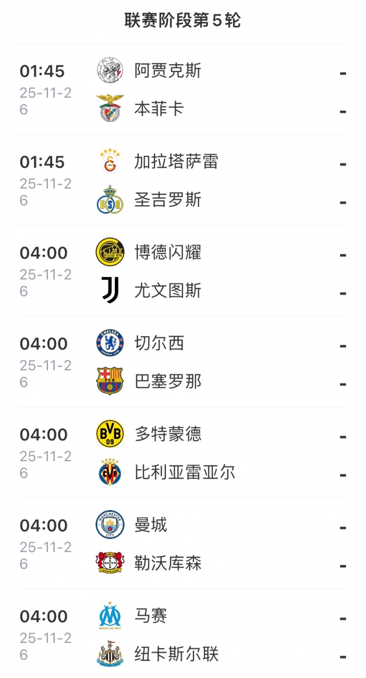 欧冠联赛阶段第5轮预报↓