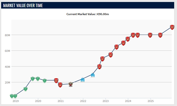 12月09日讯 德转本日更新英超联赛球员身价,萨利巴身价高涨1000万,涨至9000万欧。